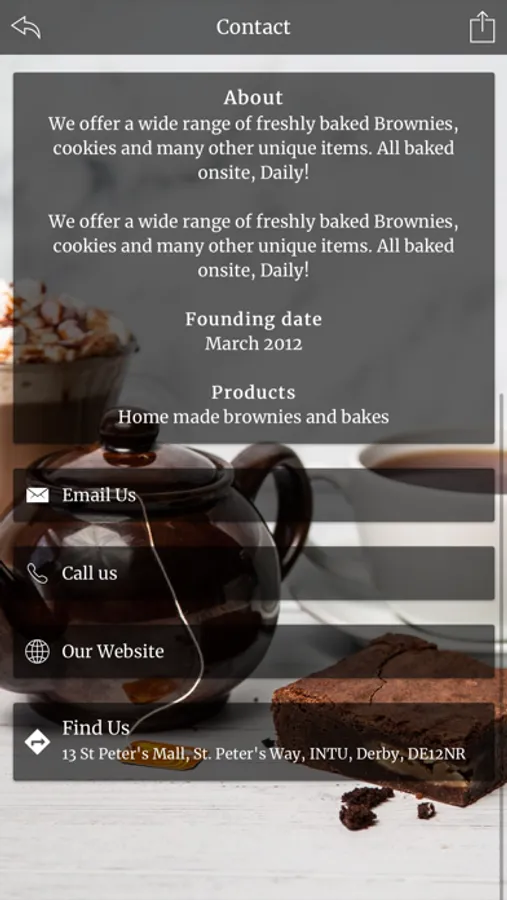 We have been Derby’s go to bakery shop for a number of years now and our business has gone from strength to strength. We have a loyal customer base and we now offer our fantastic products as corporate gifts as well as to the general public. We offer a wide range of freshly baked Brownies, cookies and many other unique items. All baked onsite, Daily! Download our App to receive exclusive access to our virtual scratch card, offers, virtual loyalty cards, birthday club and much more.