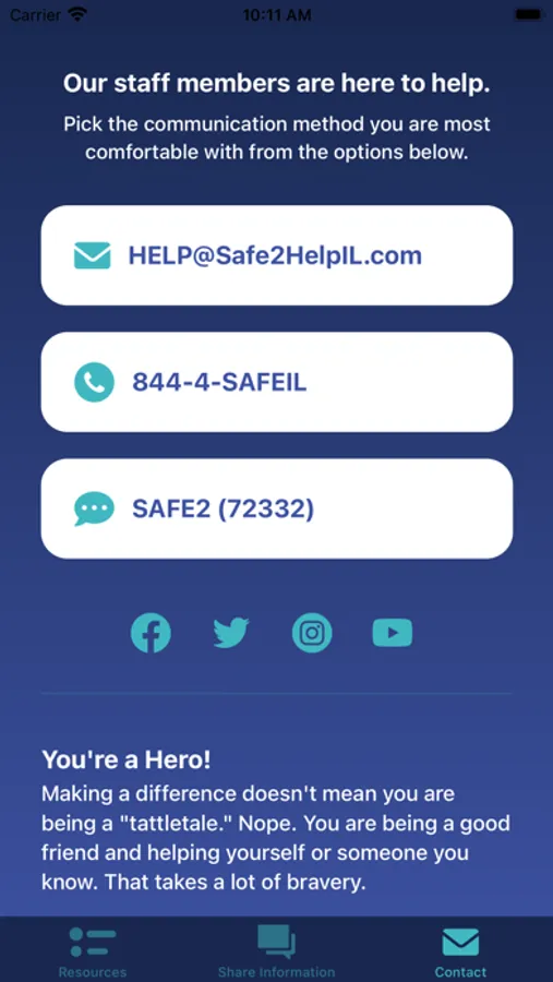 The Safe2Help Illinois app Safe2Help Illinois provides self-help resources for students and a way to share information with our 24-hour a day 7-day a week call center.