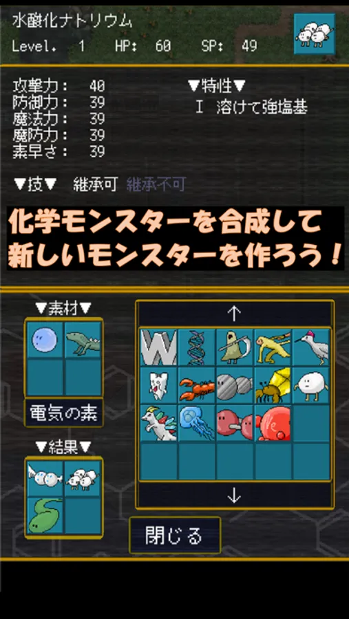 捕集、育成、合成!化学のモンスターを仲間にして、強いパーティーを作ろう!