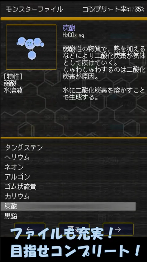 育成RPGの要素が強く、化学の知識無しでもお楽しみいただけます。