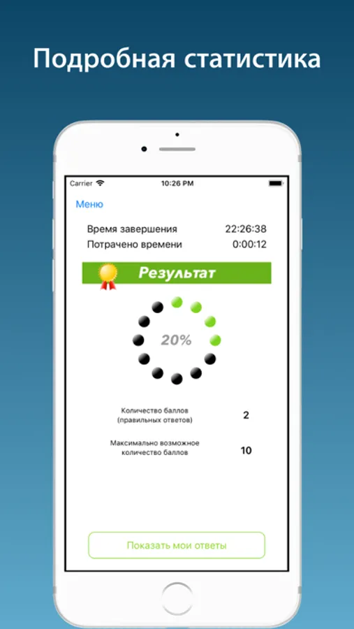 • Работа над ошибками - в режимах "Экзамен", "Марафон" и "Тренировка в избранном" Вы можете сделать работу над ошибками.