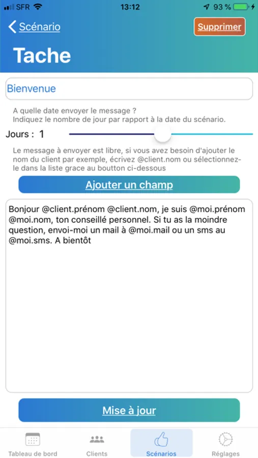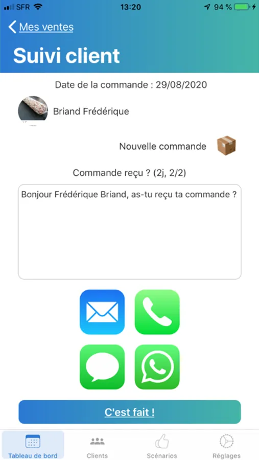 L'application vous proposera alors automatiquement le bon message de contact au bon moment pour que vous puissiez suivre vos clients de la meilleure manière possible.
