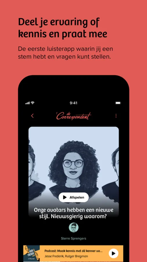 Je kunt niet alleen luisteren naar je favoriete shows of artikelen, jij hebt ook zélf een stem. In de app kun je in gesprek met correspondenten, geïnterviewde, experts en andere leden van De Correspondent. Stel jouw vragen of deel je kennis en ervaring.
