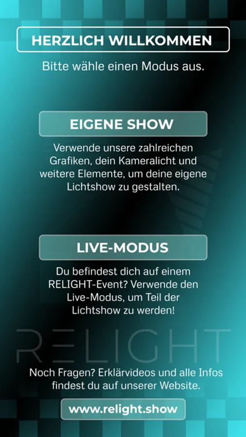 Mit RELIGHT wirst Du mit Deinem Smartphone zu einem aktiven Teilnehmer der Lichtshow Deines Lieblingskünstlers oder kannst selbst kreativ werden.
