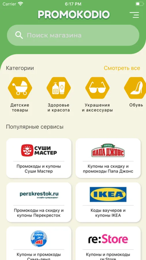 Promokodio.com – это проект, цель которого помогать пользователям экономить деньги, совершая покупки в интернет-магазинах, мобильных приложения, заказывая услуги в тех или иных компаниях. Наш сервис является своеобразным гидом по распродажам, акциям, скидкам и выгодным предложениям всевозможных ресурсов, в том числе и интернет-магазинов.