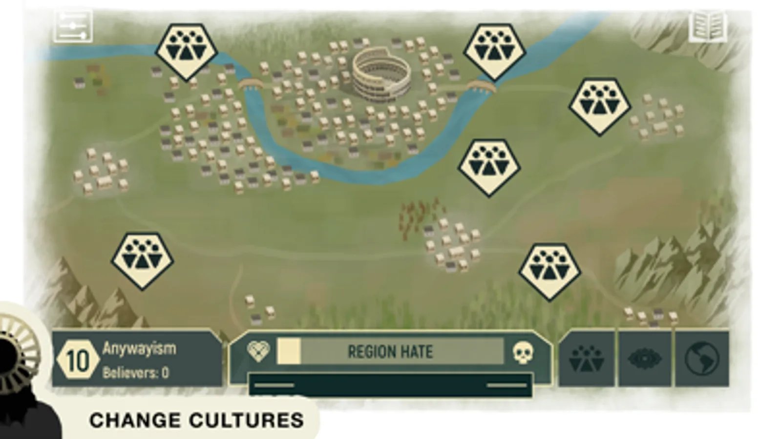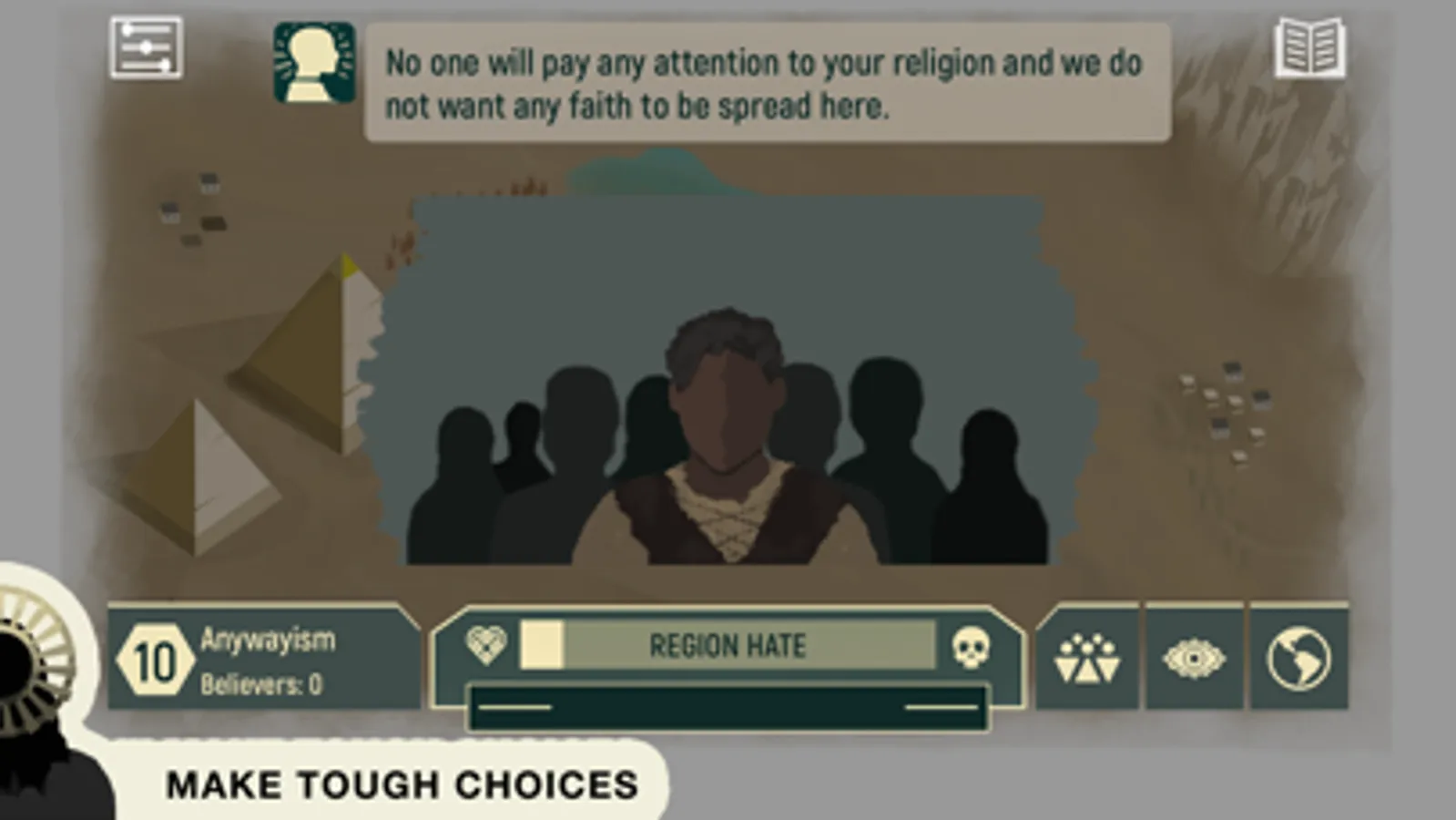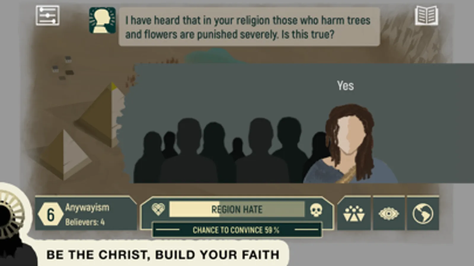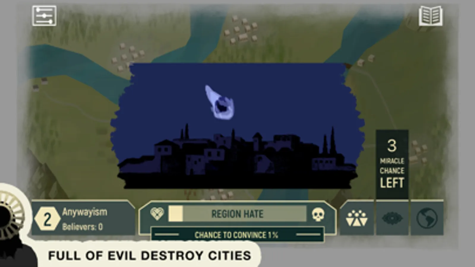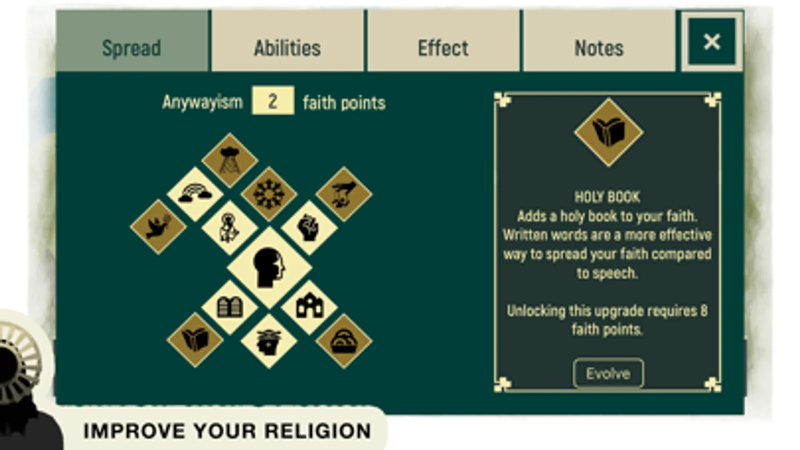You can upgrade your religion to reach more people and improve yourself to perform miracles or cause calamities.