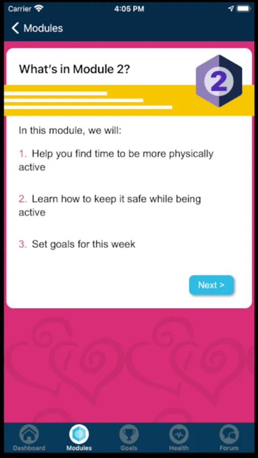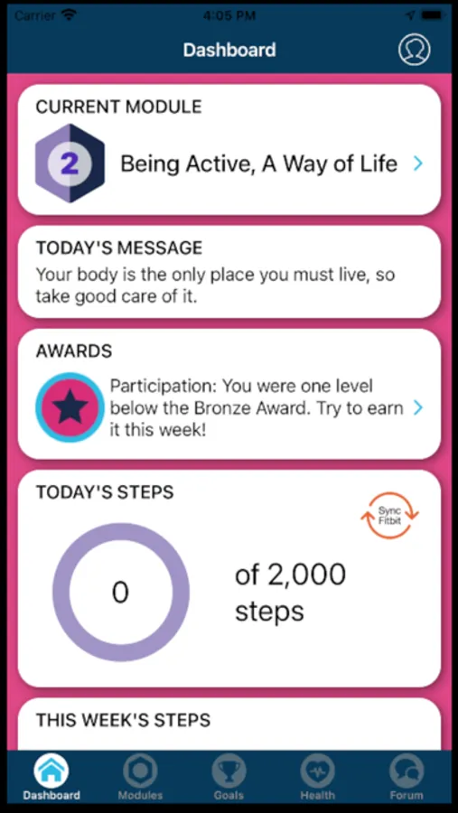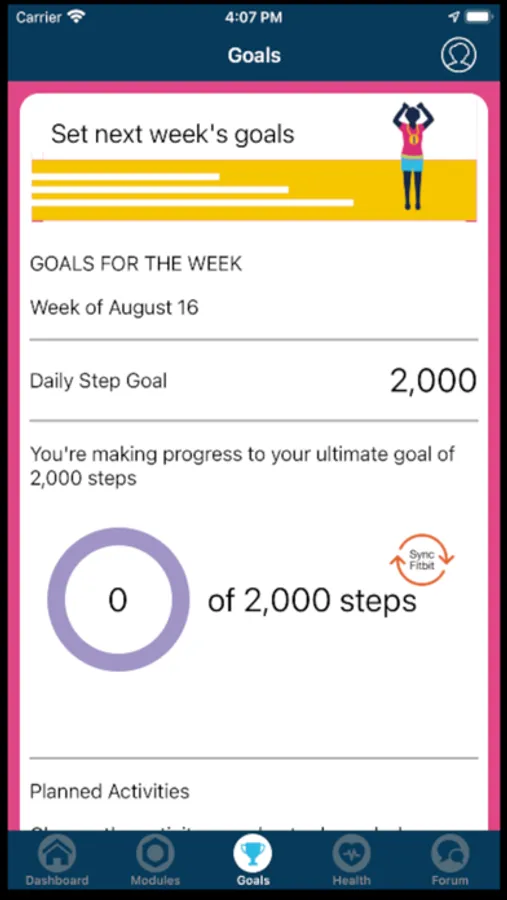 Step it Up is a general wellness app designed to encourage low cost, community centered, physical activity. The program focuses on exercise, healthy eating, and behavior change with personalized feedback tools that support cardiovascular health. Local geofences specific to the user will trigger text location opportunities for exercise. Step it Up includes educational modules and a social support forum. Participants will connect their Fitbit device, Aria II scale, Omron blood pressure device and the option for logging daily blood glucose.
