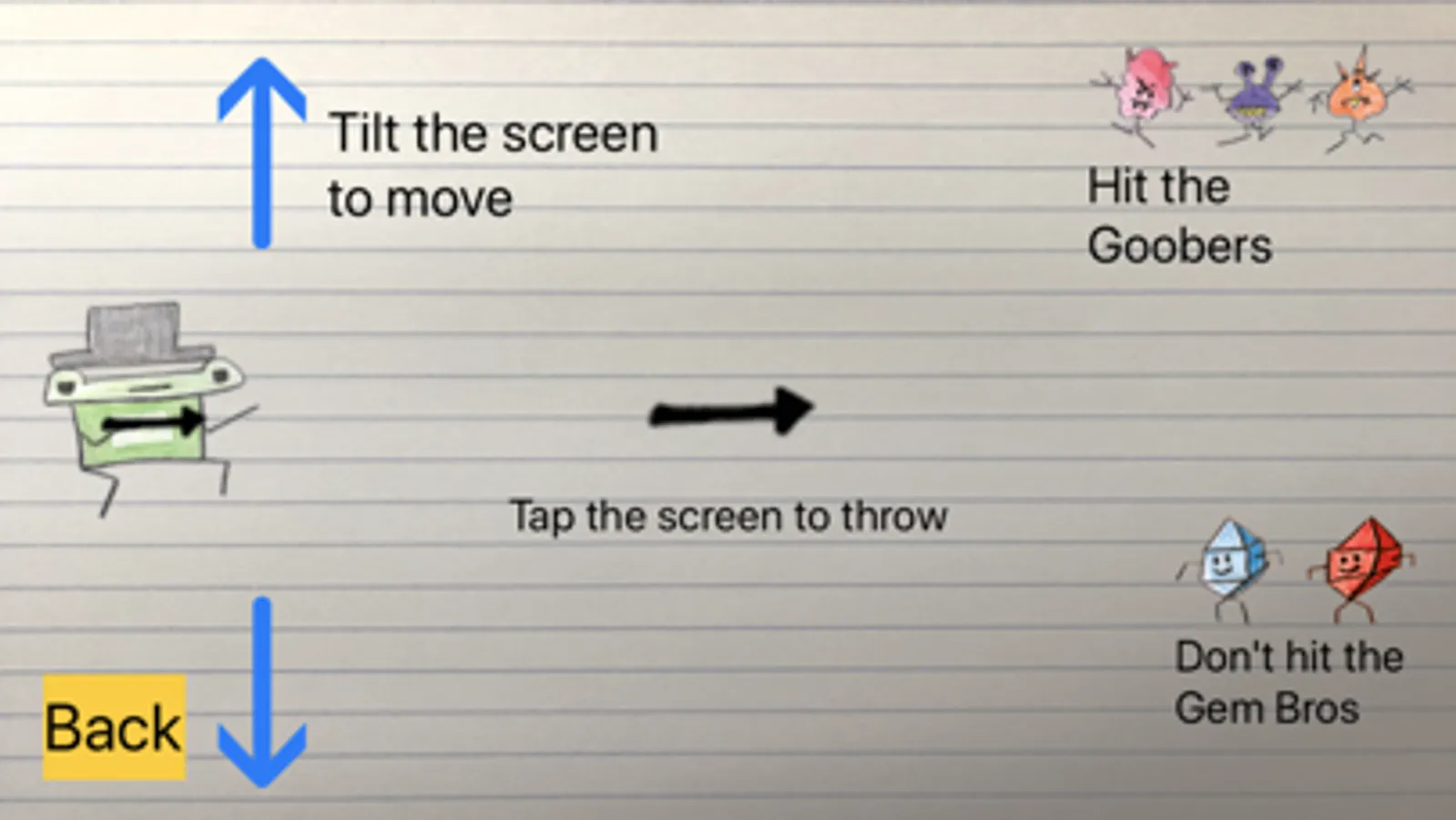 Simple, easy, super fun game. Protect the doodle world from the menace of the Goobers. Tap your screen to throw arrows and keep the Goobers from reaching the other side. However, be careful because the friendly Gem Bros and DO NOT hit them because they are fleeing from the Goobers to your protection. Also upload your own doodles to be the hero of your own story