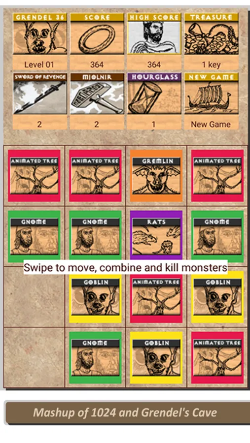Grendel36 is a mashup of the popular 2048 style tile game and the legacy online game Grendel’s Cave, creating Grendel36 2048! Are you ready for the fun of the classic 2048 puzzle with the added excitement and strategy of earning magical weapons and using these to kill monsters and even switch monster positions on the game board? Are you ready to face Grendel, build an amulet by combining monsters, kill Grendel and win the Game? Are you ready to face Grendel’s Mother, build the Giant Sword and kill her? Are you ready to kill the Dragon, become a dragon slayer hero and make it to Valhalla?