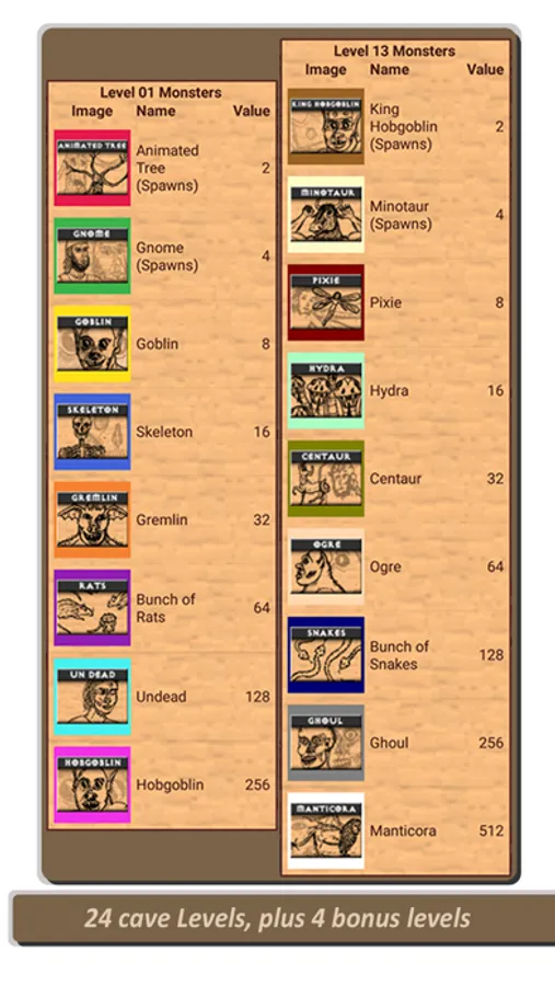 There are 24 cave levels, with top value monsters ranging from 512 to 1024. There are four advance levels; the end of the pools of water is a 2048 level where you find and stomp the Cyclops, Heorot Hall is a 2048 level where you wrestle Grendel, the Mere is a 4096 level where you battle Grendel’s Mother and the Dragon’s Lair is an 8192 level where you slay the Dragon.