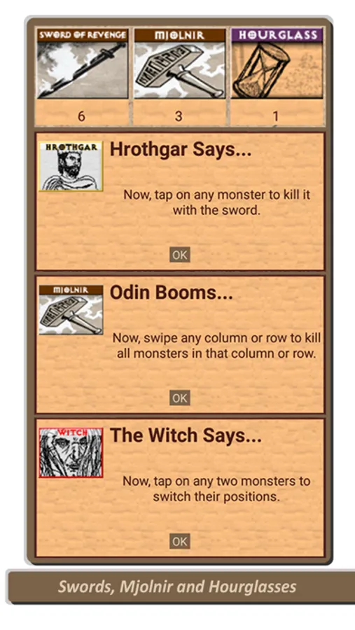 How do you play Grendel36? You swipe the screen up, down, left and right on a 4x4 game board to combine monster tiles of the same kind. When two of the same kind of monsters touch and combine they die and spawn the next higher value monster in their place. After each move a new monster tile randomly appears on an empty spot on the board. Keep sliding monsters to combine them into higher and higher value monsters, until you combine the two highest value monsters for the level and advance to the next level . You earn magical weapons by combining three or more of the same monsters in a row. Use these magical weapons to cheat the game. You can use swords to strike and kill a monster directly. You can use Thor’s Hammer, Mjolnir, to strike an entire row or column of monsters and kill them all. You can use the Witch’s magical Hourglass to switch the position of monsters on the board and create more and better moves in the game.