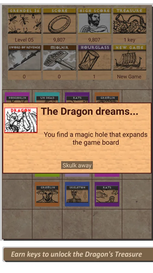 As you advance from one level to the next you gain more bonus weapons and even keys to the Dragon’s treasure. Use the keys for a chance to steal items from the treasure, swords, Mjolnir, Hourglasses and perhaps, if you are lucky, a Magic Hole that will increase the game board size to 5x5 or even bigger.