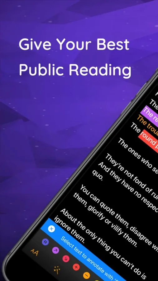 Text is presented in an optimal format for reading, in a customizable, distraction free environment. Optionally, text can be stabilized by use of the motion sensors in your device to help compensate for hand tremors. Text can be scrolled automatically, just like a tele-prompt, speeding up or down in reaction to your actual rate of speech. Special customizable annotation tools are also available, allowing you to mark areas in the text that you want to read in a specific way, like softly or with particular stress (known as suprasegmentals).