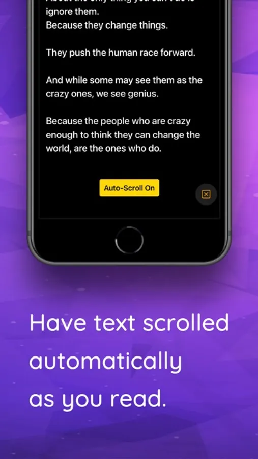 - Auto-Scroll: Text can be scrolled automatically, just like a tele-prompt, based on your chosen speed in words per minute. Speech recognition can then used to change the speed in reaction to your rate of speech. Should you need to, simply touching and holding on the text will pause scrolling, and you are still free to scroll manually if you desire.