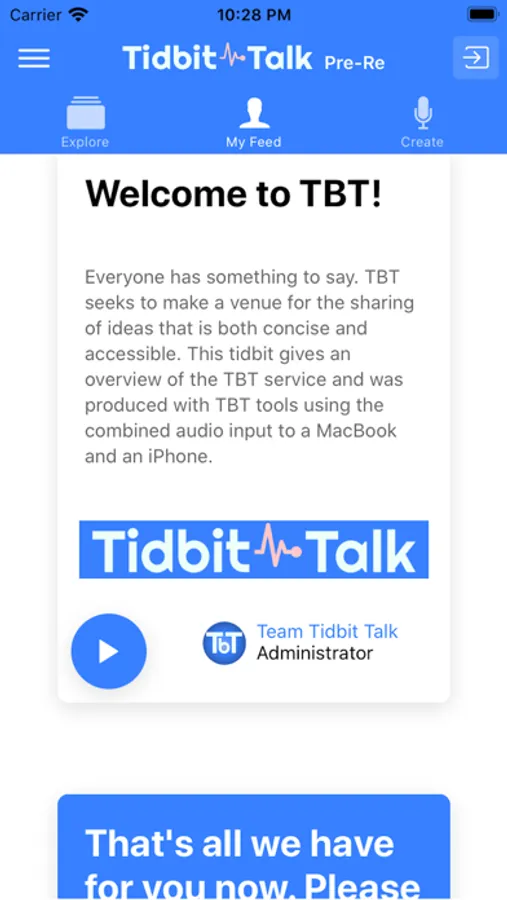 Everyone has something to say. Tidbit Talk, known as TBT, seeks to make a venue for the sharing of ideas that is both concise and accessible. Through TBT, one can both easily listen to and create short audio segments called tidbits, which can be anywhere from 0-5 minutes long. The exchange of knowledge has never been easier!