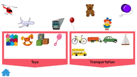 In this activity, the user chooses from 1 to 3 semantic categories on which to focus. Pictured subordinate members are scattered at the top of the screen. The user is directed to drag the pictured items to their appropriate category container.