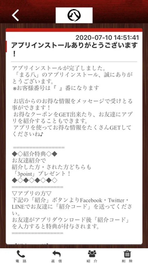 まる八のアプリをSNSを通じてお友達に紹介する事ができます。