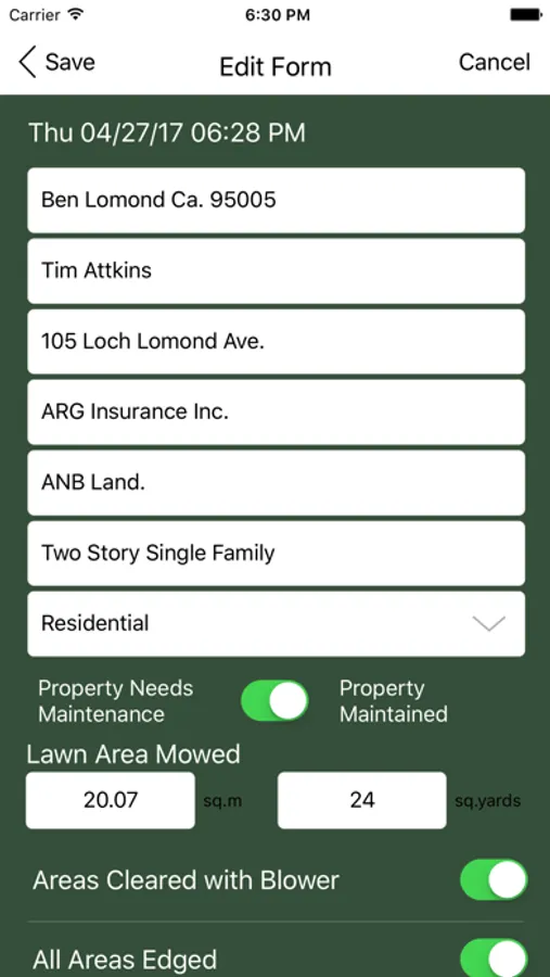 Areas properly maintained may be selected and auto-filled into the document. This document satisfies most insurance, property, and homeowner documentation. Images of planted areas, flower bed, lawns and fields, trees can be captured and time-date stamped into the certification document.