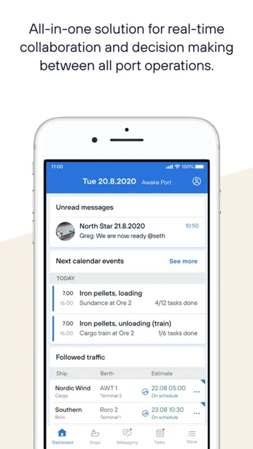 Smart Port Mobile gives you a full picture of the ship traffic at your port. With AI-powered ETAs, comprehensive port call timelines and detailed ship info, you will always have all the needed information with you.