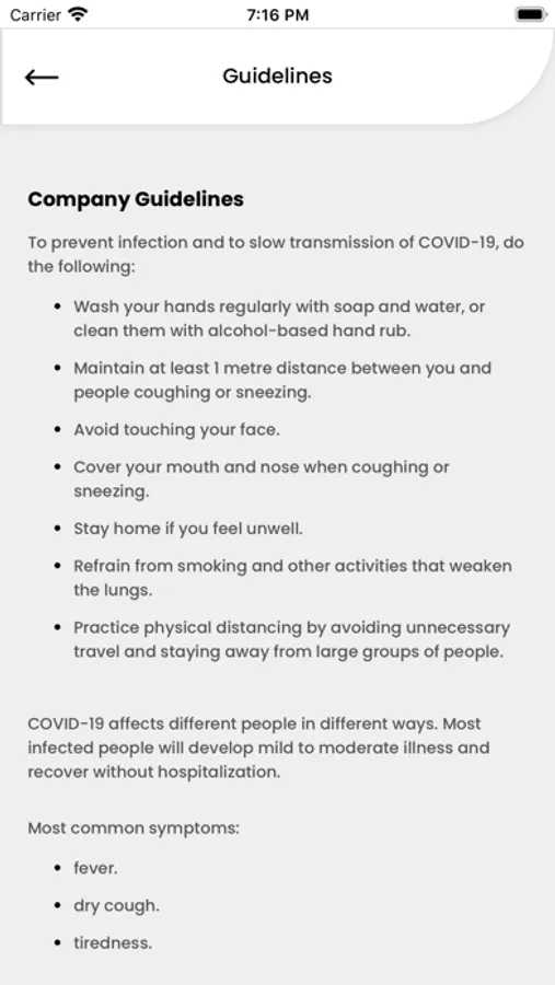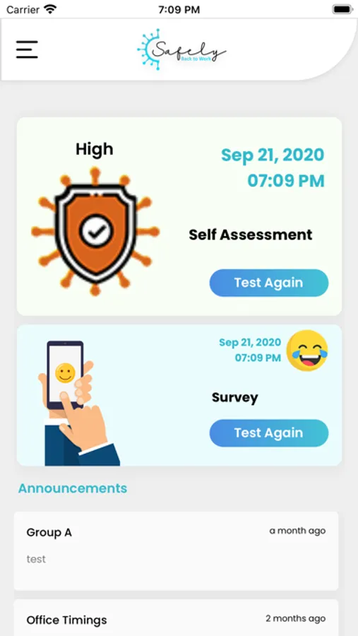 Safely Back to Work is an app to assist Businesses get back to normal as they reopen their offices. It can be used as a platform to publish their guidelines at work place and also a tool to take quick assessments regarding any symptoms they see according to CDC guidelines. An option to post office wide surveys is also provided. The announcements feature can be used to keep the employees updated on office policies, timings etc.