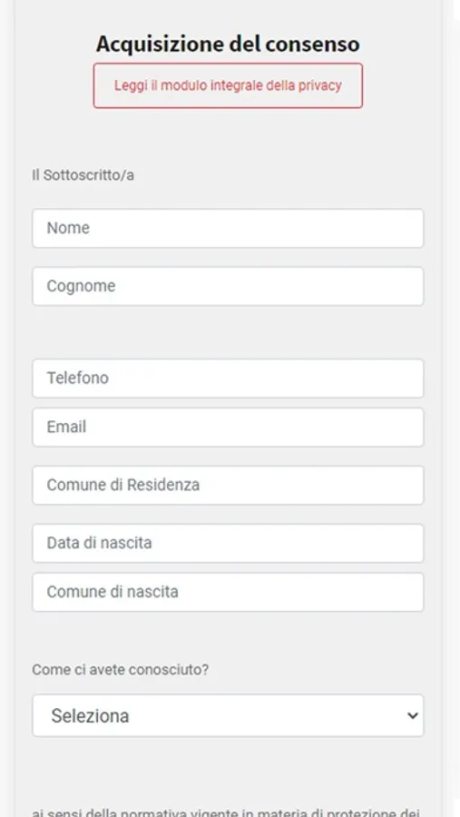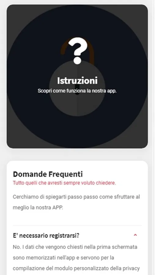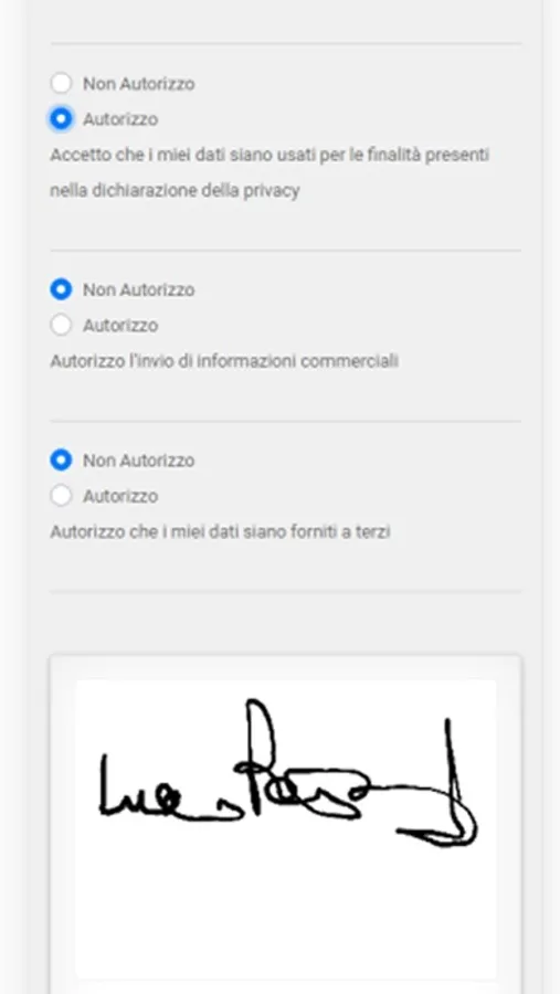 Una volta scaricata l'APP, vi verrà chiesto di inserire i vostri dati principali che servono per il completamento dell'informativa. Dopo di che selezionate la voce COMPILA. I vostri clienti potranno riempire i campi e accettare o rifiutare le condizioni e firmare sullo schermo.