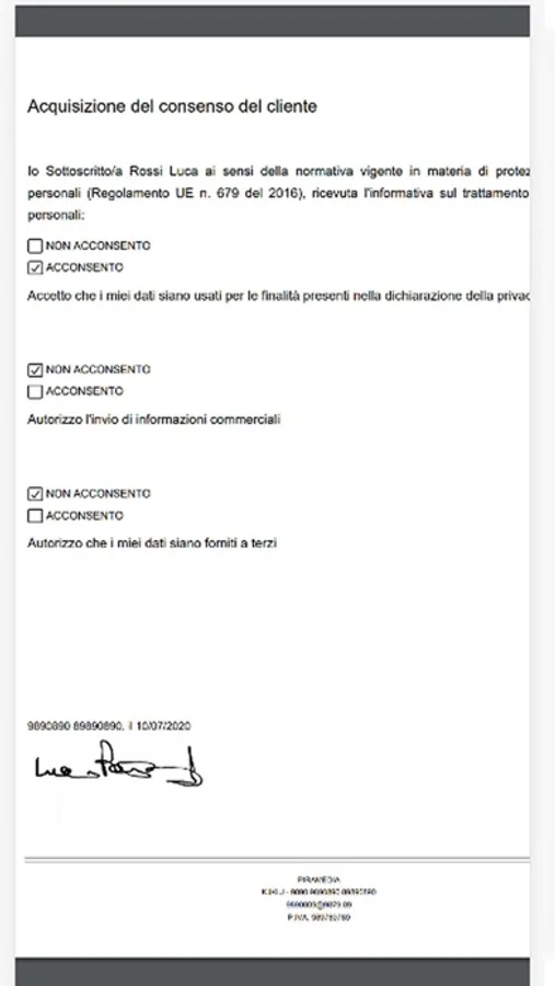 Per ogni cliente verrà creato un PDF contentente tutti i dati e la firma che potrete poi archiviare, stampare o inviare dove volete.