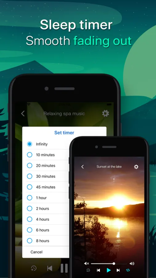 - Fade out system that gradually mutes the music towards the end so as not to disturb your state of relaxation, meditation or sleep.