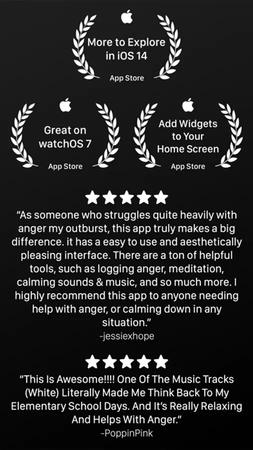 - "As someone who struggles quite heavily with anger my outburst, this app truly makes a big difference. it has a easy to use and aesthetically pleasing interface. There are a ton of helpful tools, such as logging anger, meditation, calming sounds & music, and so much more. I highly recommend this app to anyone needing help with anger, or calming down in any situation."