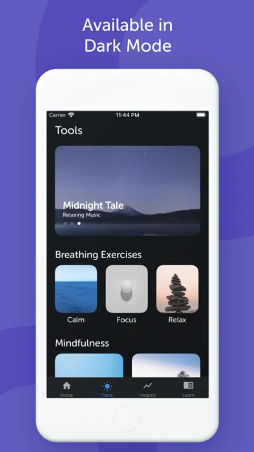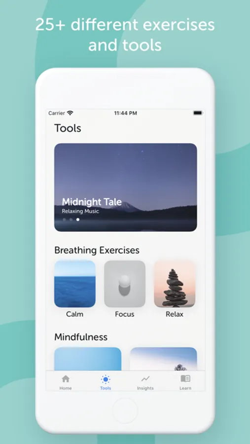 Users can select from 25+ different tools and exercises to help calm down and relax.