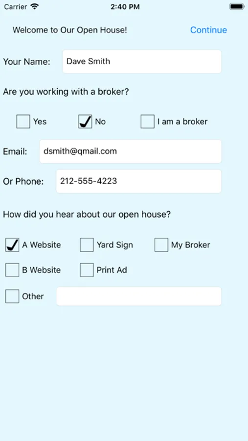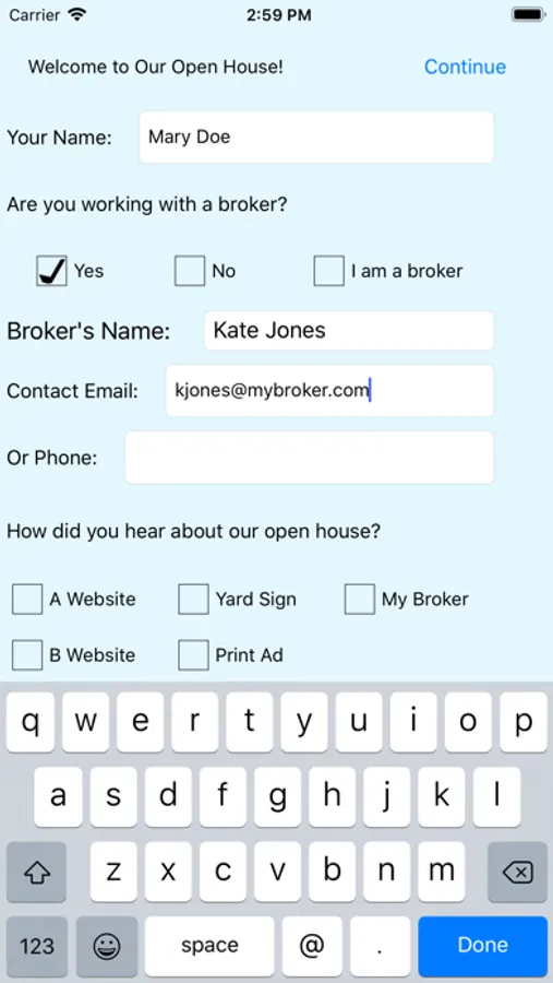 SignQ is an app to to collect contact information from visitors at an open house event. You can customize the welcome screen to add photos, floorpans, and posters that play in a slide show when no one is signing in. SignQ can also be customized to ask visitors how they heard about the open house and whether they want any documents (i.e. floor plans, fact sheets etc.) emailed to them. Once the open house is over the visitor list can be emailed as a plain email list or as a comma separated value file. The app can be used without an internet connection during the event, and the emails may be sent later when a wifi connection is available.