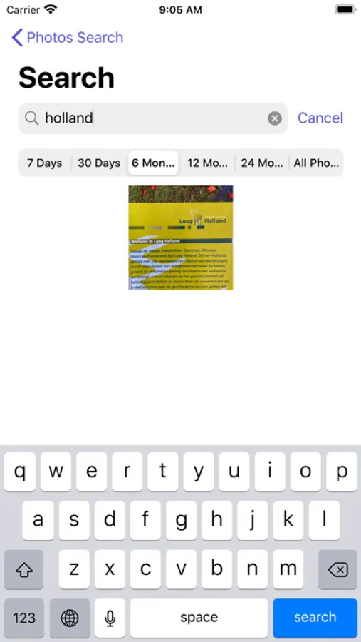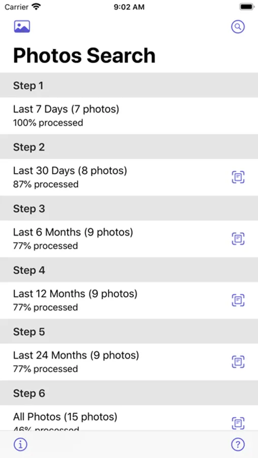 You can scan a selected time period (7 days, 30 days, 6 months etc.) or scan all your photos. Once a photo has been processed, you will not have to scan it again, so after a while you will have processed your complete photos library and it will be ready to be searched instantaneously.