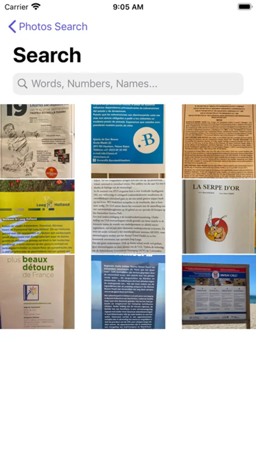 Photos Search can search for text in your photos library. It uses Text Recognition software to find text in a photo. Spotlight is supported, so you can search directly from the Home Screen.