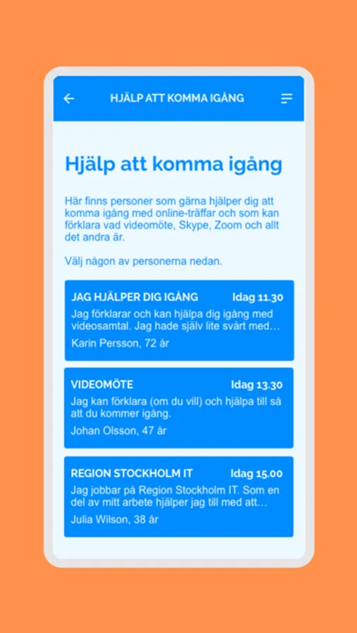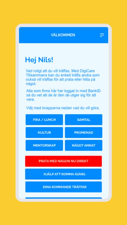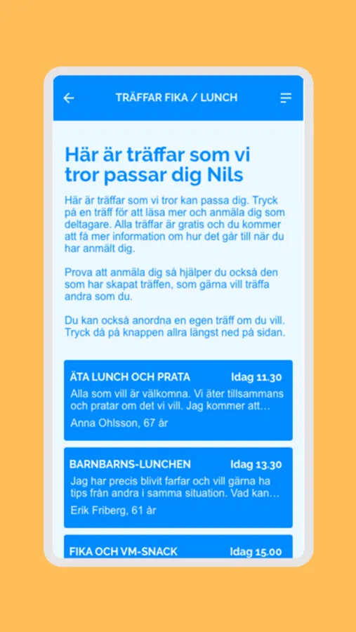 Här kan du träffa och umgås med andra människor på olika teman, t.ex. i grupper för kultur, sport eller fika. Träffarna är online, fysiskt eller hybridträffar (d.v.s. du kan välja att delta online eller fysiskt). I appen får du instruktioner hur du ska gå till väga och om det är svårt kan du även få hjälp att komma igång per telefon.