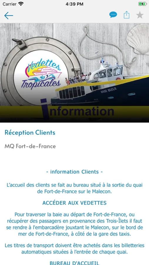 L'Application "Vedettes Tropicale" est gratuite et facile à utiliser. Géolocalisez les Ports d'embarquements, les destinations ou dessertes ainsi que les services d'informations qui vous permettrons d'utiliser les Navettes dans le plus grand confort. Vous pourrez aussi réserver l'ensemble de vos forfaits et abonnements et recevoir nos informations ou des messages de dernières minutes.