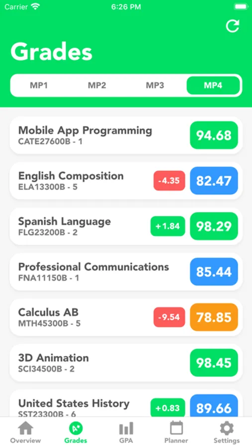 View your class averages over time to see trends and improvements. You can also see how your average has changed since the last time you opened the app, and see which grades have been recently added.