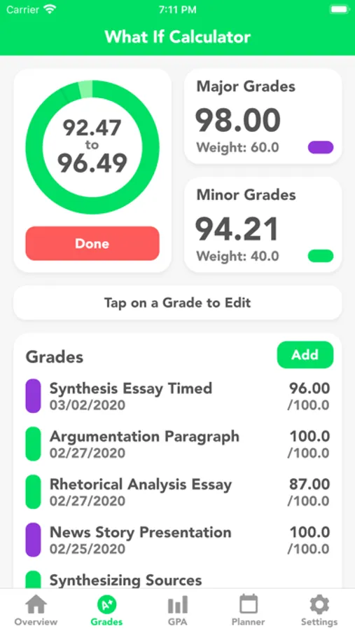Predict your average by adding mock grades and changing scores to see how it affects your average. This will help you better set goals for the scores you need in the future.
