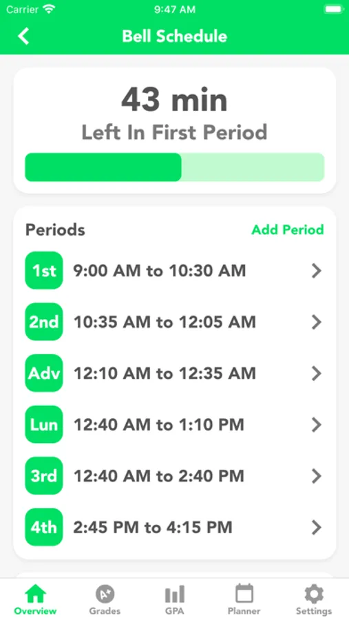 Simulate the bell and keep track of time with a custom bell schedule. See how much time is left in each period and get notified before the next one starts so you are never late. Students in online school will be able to follow the same schedule they’re used to, at home!