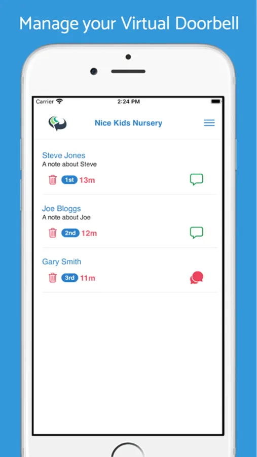 - A day nursery needs to be alerted when parents are ready to drop off / collect their child, but would prefer the parents not to touch the doorbell or congregate in the waiting area.
