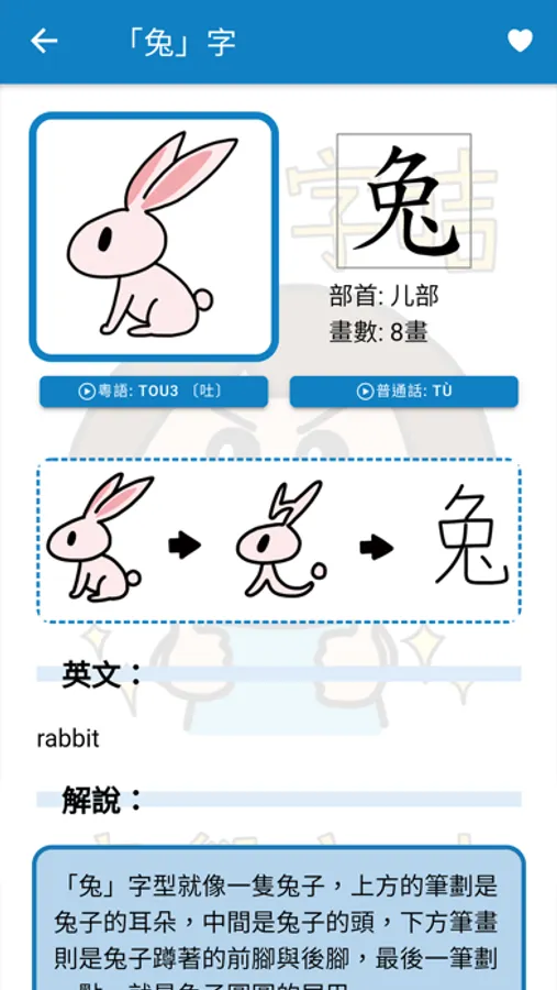 本程式是「香港兒童讀寫學習研究協會」與插畫師「路邊攤」及《香港小學習字表》合作推出的《童學字咭》應用程式。用家透過掃描字咭上的QR Code,能夠尋找到相應中文字的筆順、字帖、詞彙和發音等,用簡單有趣的方法,幫助小朋友認識中文字。