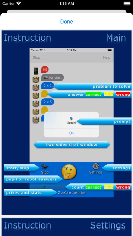 Correct answers are encouraged by offering virtual prizes that can be used in other mobile applications to share your achievements with friends and family.