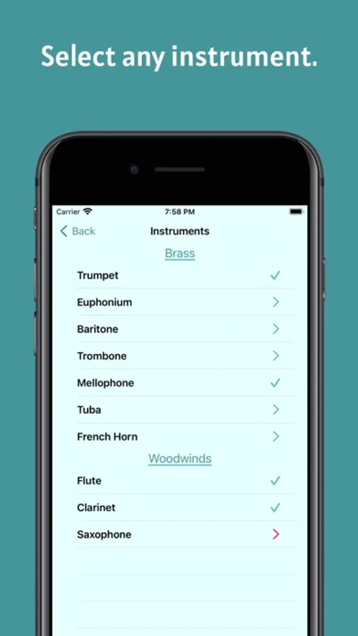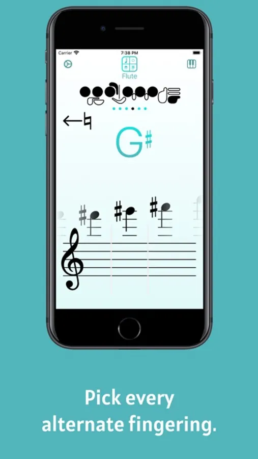 - A main picker screen to select a note, with the ability to swipe through alternate fingerings