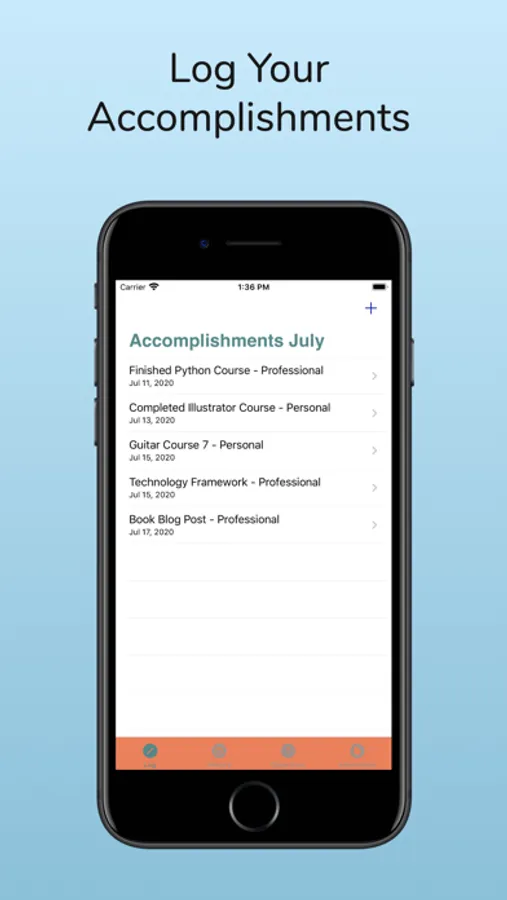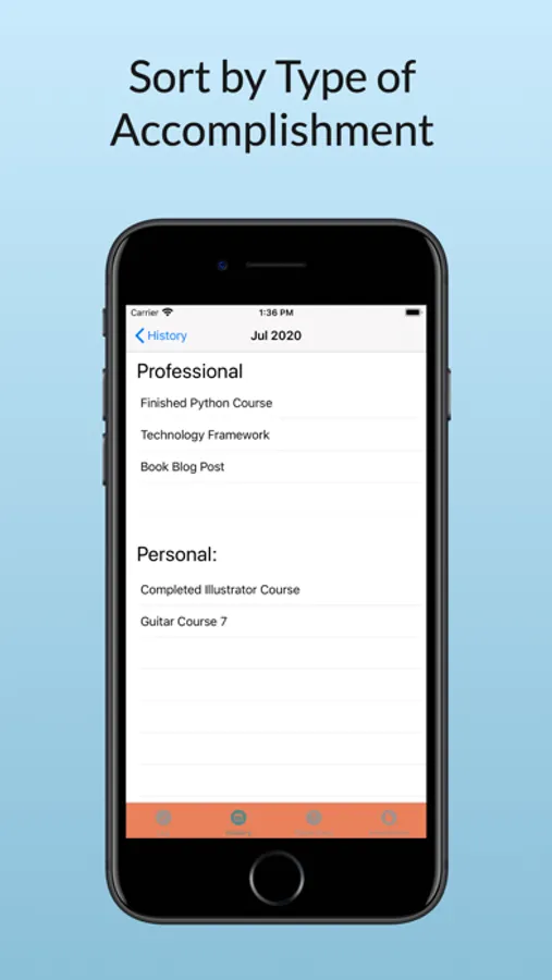 Writing down your accomplishments will allow you to effortlessly fill out resumes, college applications, and job applications without having to worry about forgetting all that you have achieved. Looking through the History tab, you can see your accomplishments sorted by months and whether it is a "professional" or "personal" achievement.