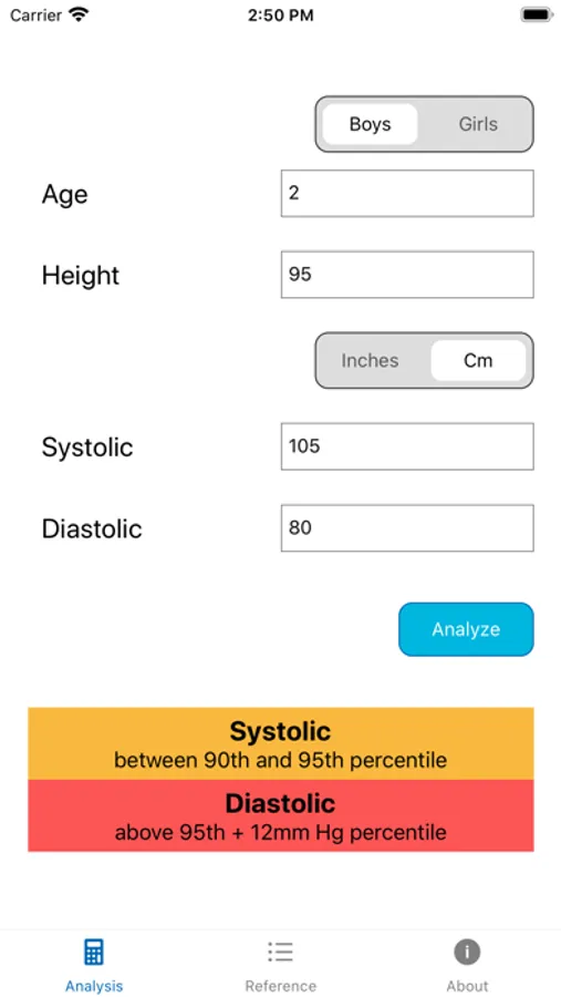 PedBP is a blood pressure analysis and reference app for use with children ages 1-17. Quickly analyze the blood pressure with the Analysis tool, or look up the values for height percentiles by age using the Reference Table.