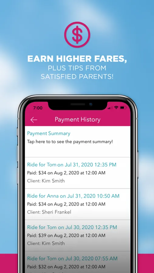 With greater responsibility and experience, comes reward! Earn higher ride fares, plus tips from satisfied parents. Get paid out several times per week, and easily review your earnings in the app at any time.