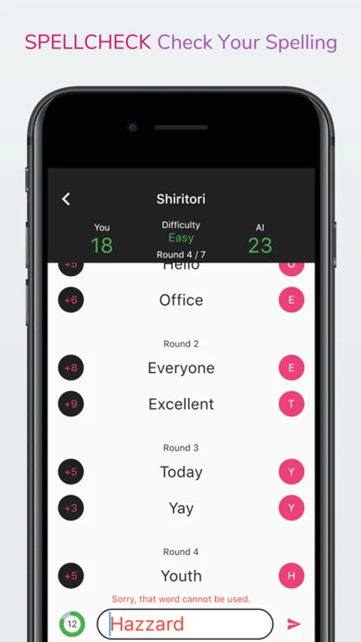 Hard: 20 rounds, and the AI opponent can use words of up to 15 letters. This is legitimately hard for native English speakers.