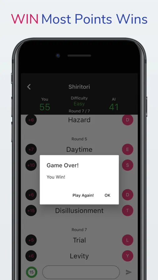 Medium: 15 rounds, and the AI opponent can use words of up to 10 letters. A little bit harder than Easy.