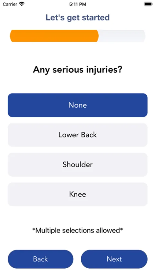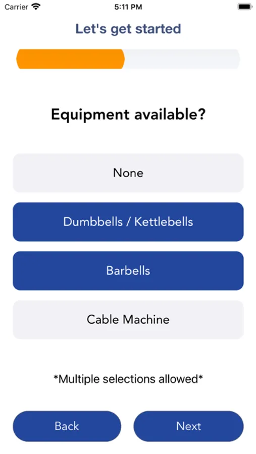 · Equipment availability (None, Dumbbells/Kettlebells, Barbell, Cable Machine)