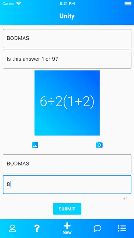 Unity is a platform on which students can ask maths problems and answer the problems of their peers. The platform allows students to include both text and an image in their questions and answers, as well as vote "up" the answers they believe to be correct.
