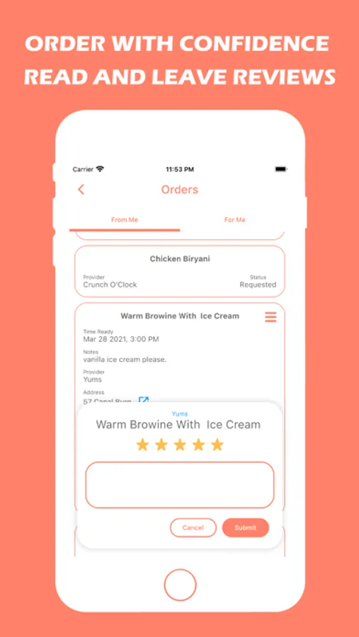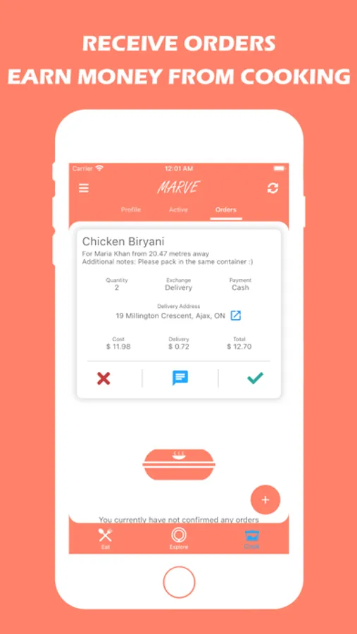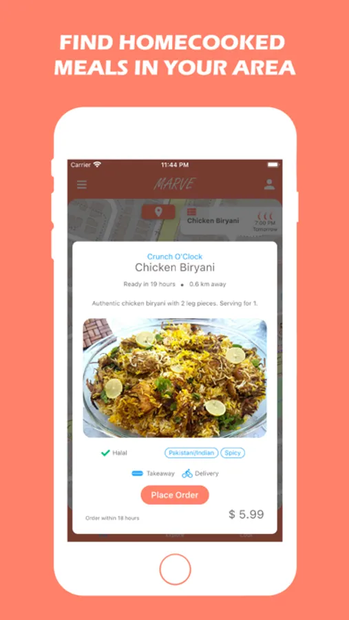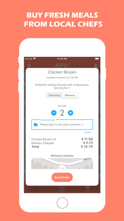 What if you're not in the mood to cook today? Or what if you're too busy? In that case, open Marve to see the meals in your surroundings that are being cooked today. If you're interested then place an order, and if the cook thinks they can fulfill your order, they'll accept the request and prepare your meal alongside their own.