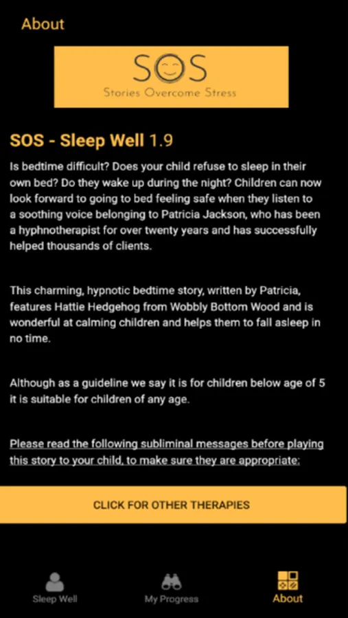 Do not play this recording when it can be heard by anyone driving or operating machinery as it can cause drowsiness. Only play and listen when it is safe for everyone within hearing distance, to do so. Every story has the same beginning that safely guides your child into a relaxed state. This story is for entertainment only and is not intended for medical purposes for which you should always consult your doctor.